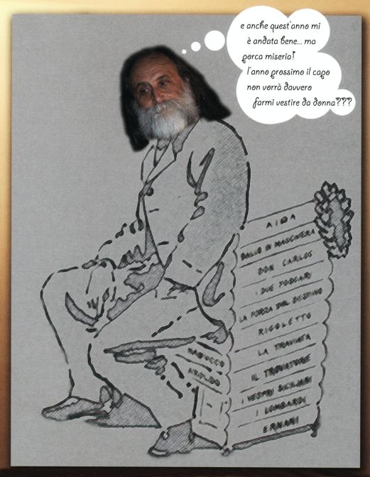 La vignetta d’epoca è quella di copertina, Verdi seduto su una poltrona fatta con gli spartiti delle sue opere, di F. Bianco.