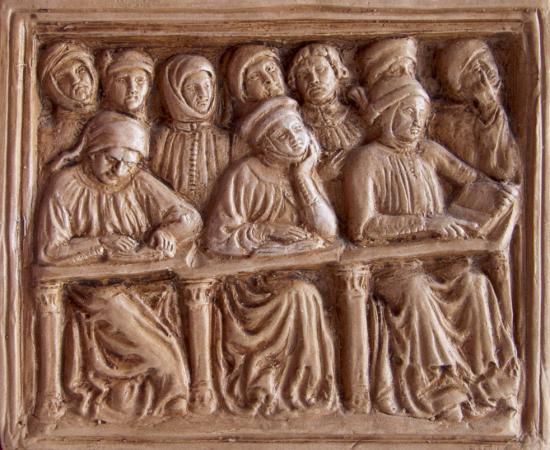 Formella della tomba di Giovanni da Legnano (1383), vi sono rappresentati alcuni studenti nell’atto di ascoltare e trascrivere le lezioni del maestro, Museo Civico Medievale, Bologna