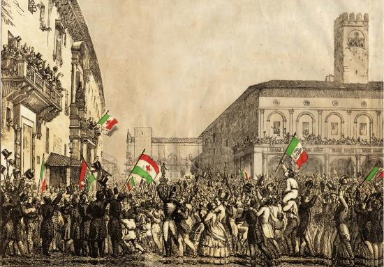 Piazza Maggiore, 12 giugno 1859, stampa dell’epoca, Museo civico del Risorgimento di Bologna